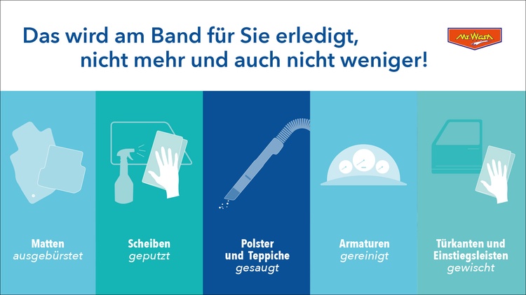 Neben der Außenreinigung bietet Mr. Wash auch die praktische Innenreinigung am Fließband an. Während Ihr Fahrzeug durch die Innenreinigung transportiert wird, kümmert sich ein erfahrenes Team um den Innenraum.