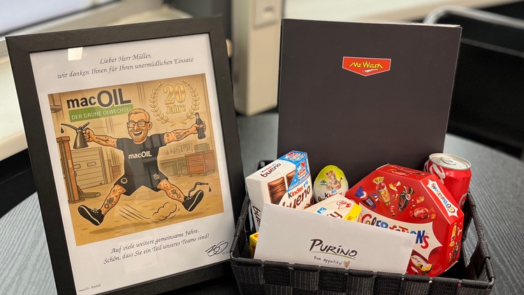 Zum 20-jährigen Jubiläum überreichte Service-Leiter Benjamin Bechlenberg nicht nur einen Präsentkorb, sondern auch ein handfestes Zeichen der Anerkennung: eine Betriebszugehörigkeitsprämie von 2000 Euro, als starkes Zeichen der Wertschätzung, wie sie bei macOIL gelebt wird.