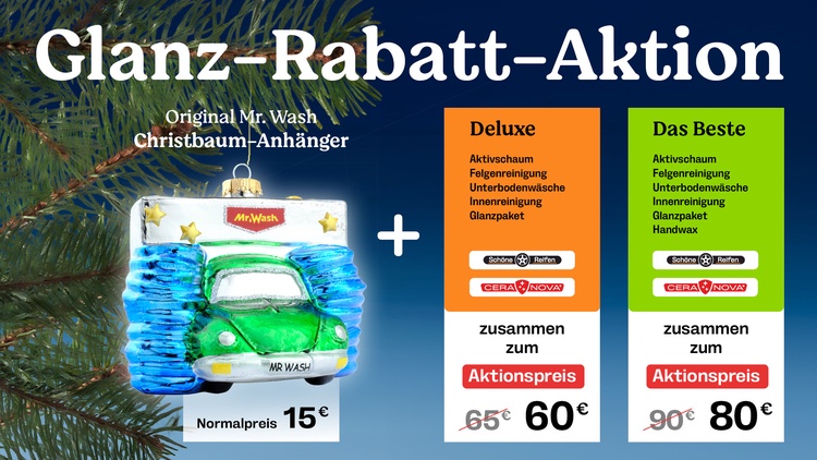 Die Glasanhänger gibt es in leuchtendem Rot oder sattem Grün in unseren Niederlassungen für je 15,- Euro zu kaufen. Aktuell haben wir ein besonderes Angebot für unsere Kundinnen und Kunden: Kombinieren Sie Ihren Glanzmoment mit einem Waschprogramm und sichern Sie sich den Christbaumanhänger zum Vorzugspreis.