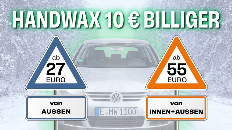 Die einfache Außenwäsche für 12 € kostet regulär zusammen mit Handwax 37 €, im Winterpaket nur 27 €. Die günstigste Kombination aus Außenwäsche, Innenreinigung und Handwax liegt im Winterpaket bei 55 € statt 65 €.