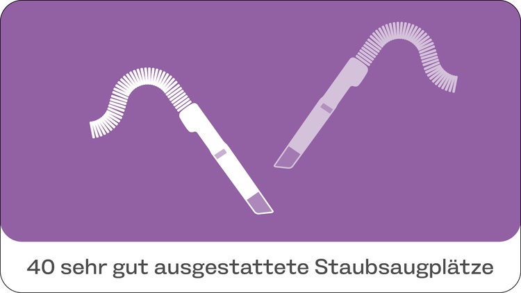 Unseren Kunden die ihr Auto selber von innen reinigen möchten, stehen 43 Staubsaugerplätze bereit. 27 davon gibt es in der großzügigen Staubsaughalle. Alle unsere Saugerplätze sind mit Mattenreinigungsmaschinen inklusive Wasserbecken, zwei Staubsaugerschläuchen sowie einer Druckluftpistole ausgestattet.