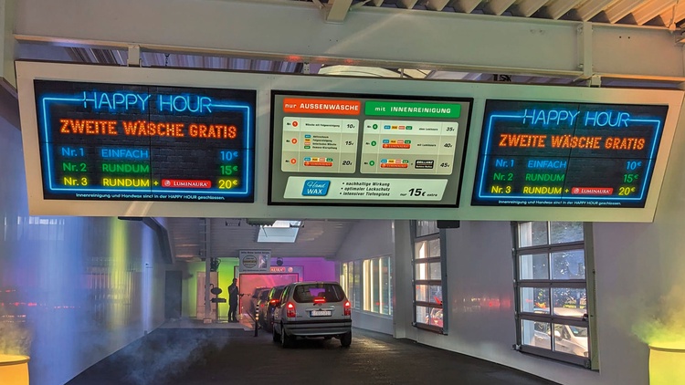In den Anlagen von Mr. Wash findet von Montag bis Freitag zwischen 18 und 19 Uhr eine ganz besondere Aktion statt. Bei der Happy Hour können die Kundinnen und Kunden ordentlich sparen, denn es gibt die nächste Außenwäsche für den gleichen Zeitraum gratis dazu. Und zusätzlich bieten wir gute Musik und bunte Lichter als perfekte Einstimmung auf einen entspannten Feierabend.