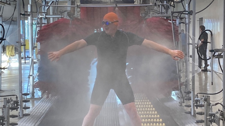 Nach Geschäftsschluss wurde er über das Förderband durch die Anlage gefahren. „Es kam mir vor wie ein Eintauchen in eine Wand aus lauter Lappen. Die ersten Wasserstrahlen zu fühlen, war spannend. Wie ein starker Nieselregen. Ich habe es richtig genossen, wie die Bürsten an mir entlang schrubbten. Total weich und angenehm. Sie haben ein Prickeln auf der Haut hinterlassen.“